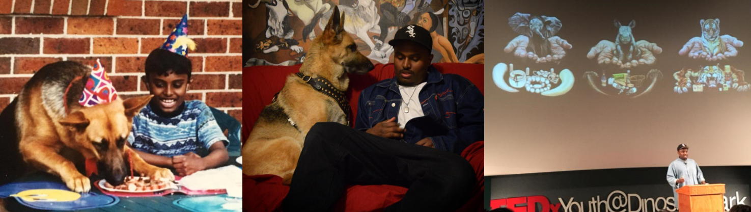 I did these paintings with K9 Angel by my side, we painted them in Los Angeles, & then finished the rhino in Santa Fe, New Mexico whilst training K9 Angel with ADW for ADI accreditation. K9 Angel & me first exhibited them at the Defenders of Wildlife Southwest office opening thanks to Laura Mae Eaton. Then we both flew to Miami to present them to the public for the first time during Art Basel together. K9 Angel & I got to present these same paintings on the TEDxYouth Stage in South Dakota in 2017. We always presented these paintings together as a team. To have them at the National Museum of Wildlife Art for a major exhibition meant a lot to me; I know she’s watching this proud & smiling; we were working for this.